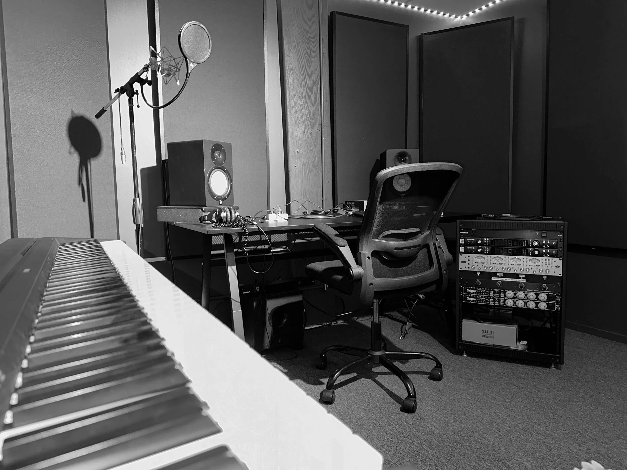 A comfortable and creative production suite designed for recording, songwriting, podcasts, voice-over work, and content creation. The space features a professional studio workstation with studio monitors, microphone setup, MIDI keyboard, and acoustic treatment for a focused recording environment. A dedicated lounge area provides a relaxed space for collaboration, writing sessions, or breaks between takes. With a simple plug-and-play setup, just connect your laptop and start creating with professional-grade audio quality. -